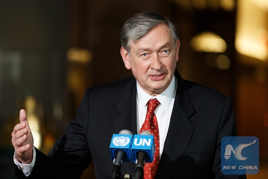 Danilo Turk, former president of Slovenia, candidate for the position of the next secretary-general, addresses the press at the United Nations headquarters in New York, April 13, 2016. (Xinhua/Li Muzi)