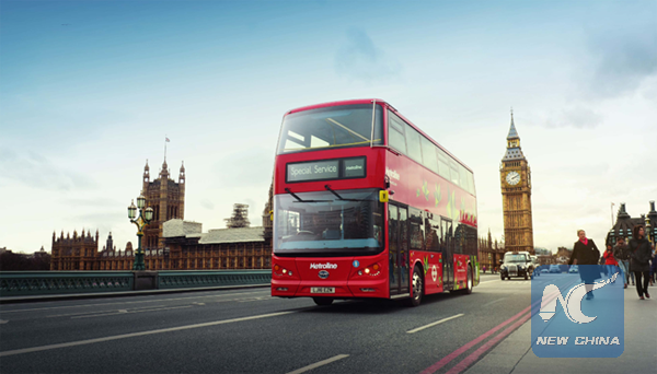 This undated photo shows the BYD pure electric double deck bus on the street of London, Britain. (Photo courtesy of BYD official website)