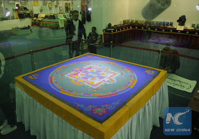 A Tibetan sand mandala on display in southwest China's Tibet Autonomous Region. (Xinhua/Jigme Dorje)