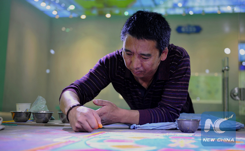 Khedtrup Gyatso works on a sand mandala. (Xinhua/Jigme Dorje)