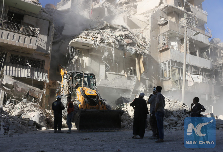 Civilians watch as a tractor clears the rubble following Syrian government forces airstrikes in the rebel held neighbourhood of Tariq a-Bab in Aleppo on September 24, 2016. (AFP/Xinhua)