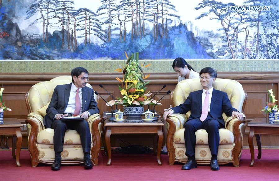 Meng Jianzhu (R), head of the Commission for Political and Legal Affairs of the Communist Party of China (CPC) Central Committee, meets with an Indian delegation led by R.N. Ravi, chairman of Joint Intelligence Committee of India, in Beijing, capital of China, Sept. 27, 2016. (Xinhua/Zhang Ling)