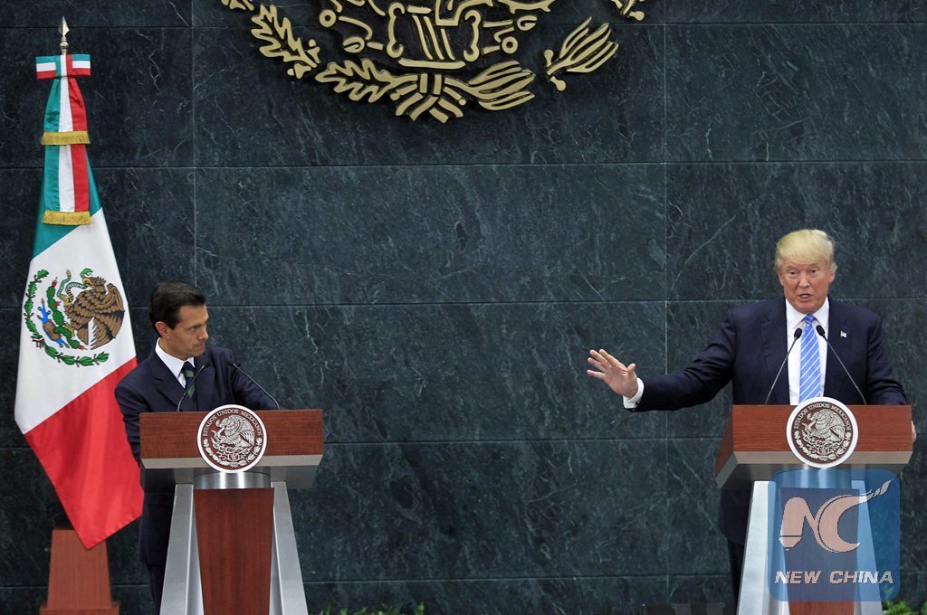 U.S. Republican presidential candidate Donald Trump (R) addresses a joint press conference with Mexican President Enrique Pena Nieto (L) after their meeting in Mexico City, capital of Mexico, on Aug. 31, 2016. (Xinhua/Str)
