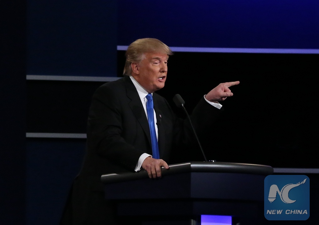 Republican Donald Trump speaks during the first presidential debate with Democrat Hillary Clinton at Hofstra University in Hempstead of New York, the United States, Sept. 26, 2016. Donald Trump and Hillary Clinton on Monday held their first presidential debate in Hempstead. (Xinhua/Qin Lang)