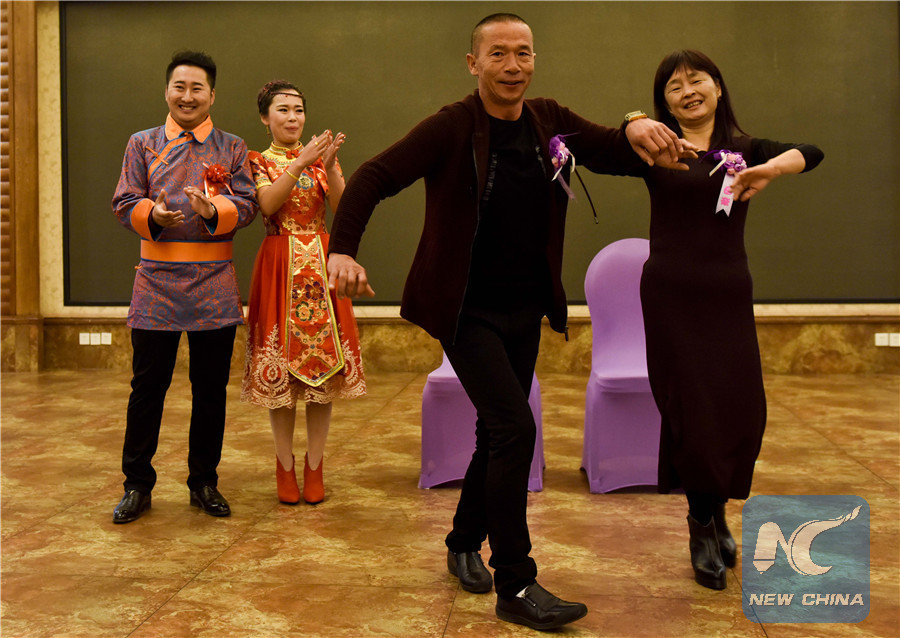Kong Ning teaches her groom Ding the Daur traditional dance.