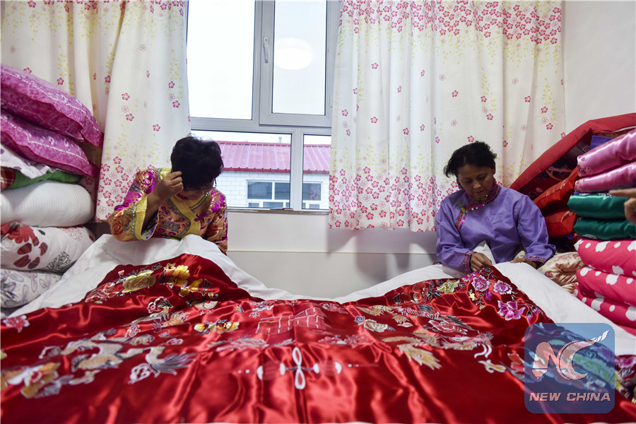 Kong Ning's aunts sew wedding quilts and prepare the wedding bed, according to Xibe customs.