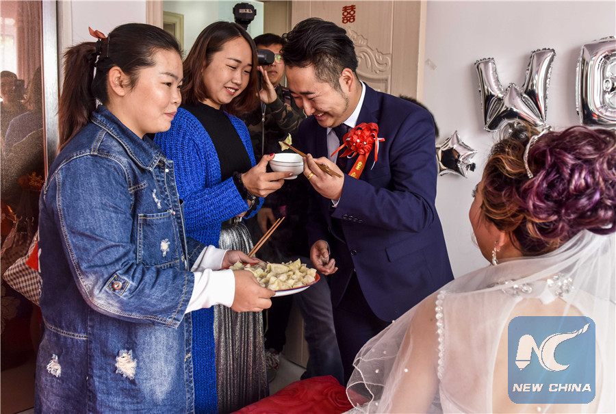 On the third day, the groom's family came to the bride's home to escort her to the groom's home to continue the wedding. However, the trip was not that easy. The groom must eat sour, sweet, bitter and spicy dumplings to show his sincerity. Of course, all sorts of obstacles set by the bride's family did not stump the groom. It was not until Kong Ning's cousin send her into the wedding car on his back that the bride escorting ritual went to an end.