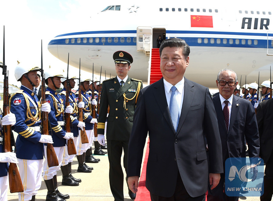 The Cambodians greeted Xi with his portraits and those of the Cambodian leader, national flags of the two countries in their hands, while the city of Phnom Penh was decorated with flowers, banners and large displays of both countries' landmarks.