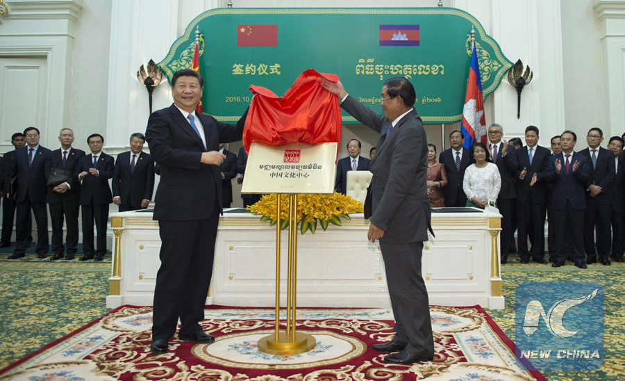 Chinese President Xi Jinping and Cambodian Prime Minister Hun Sen inaugurate the China Culture Center after their talks in Phnom Penh, Cambodia, Oct. 13, 2016. (Xinhua/Xie Huanchi)