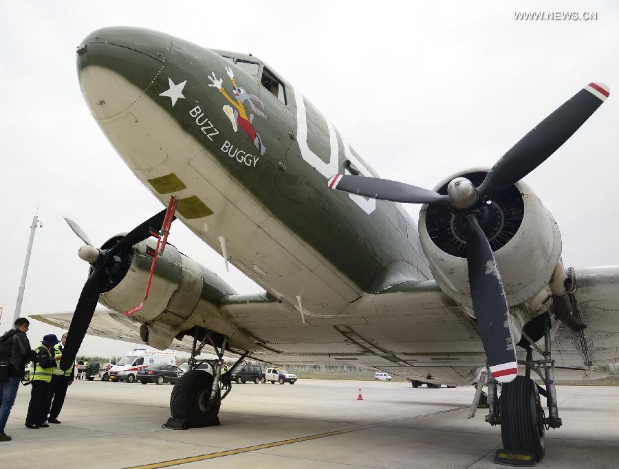 A C-47 aircraft made in 1944 is seen at Kunming Changshui International Airport, capital of southwest China's Yunnan Province, Oct. 15, 2016. The C-47 departing from Australia in August successfully flied across "the Hump" to arrive at Kunming on Saturday. It's final resting place is the Flying Tiger Heritage Park in Guilin, south China's Guangxi Zhuang Autonomous Region, as a historic exhibit. The Hump, or the "death route" over the Himalayan mountains was operated jointly by China and the United States from 1942 to 1945 to transport military supplies from India to Southwest China. (Xinhua)