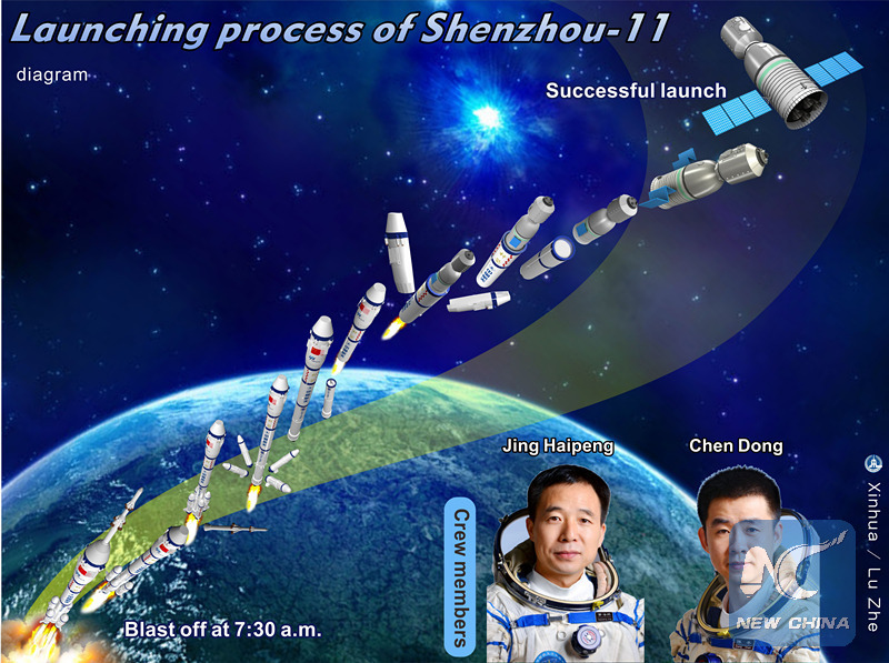 Graphics shows the launching process of Shenzhou-11 manned spacecraft. (Xinhua/Lu Zhe)