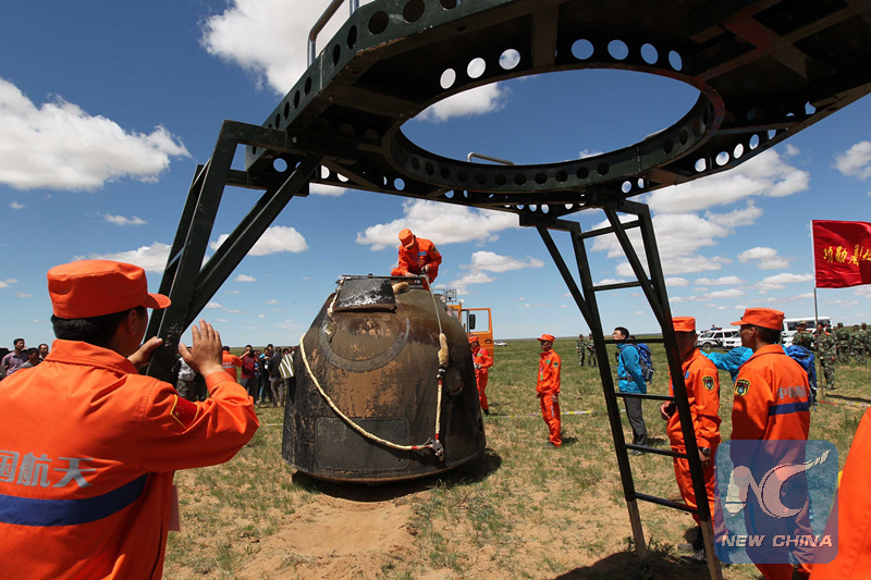 Working staff handle the re-entry capsule of China's Shenzhou-10 spacecraft after its successful landing at the main landing site in north China's Inner Mongolia Autonomous Region on June 26, 2013. (Xinhua/Wang Jianmin)