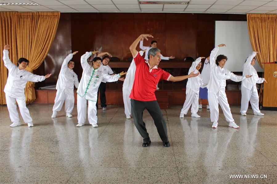 Image taken on Nov. 5, 2016 shows director general of the Police Hospital "Augusto B. Leguia" in Lima, Orlando Leiva Meza (C), taking part in a Tai Chi (shadowboxing) session in the hospital's climacteric program, in Lima, Peru. Growing up in Peru, Orlando Leiva Meza developed a fondness for Chinese cuisine and martial arts. But it was his decision to become a traditional Chinese medicine doctor that has cemented his ties with China. "It would very much help to strengthen the practice of traditional Chinese medicine, especially acupuncture," said Leiva, who is currently director general of the Police Hospital in Lima, stressing that he would like to see greater cooperation between China and Peru in the field of health. (Xinhua/Luis Camacho)