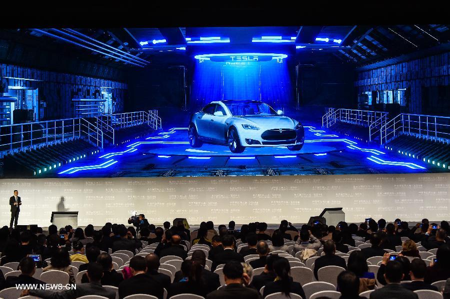 A representative of Tesla introduces an automated assistance driving system during a release ceremony of world leading internet scientific and technological achievements at the 3rd World Internet Conference in Wuzhen, east China's Zhejiang Province, Nov. 16, 2016. (Xinhua/XuYu)