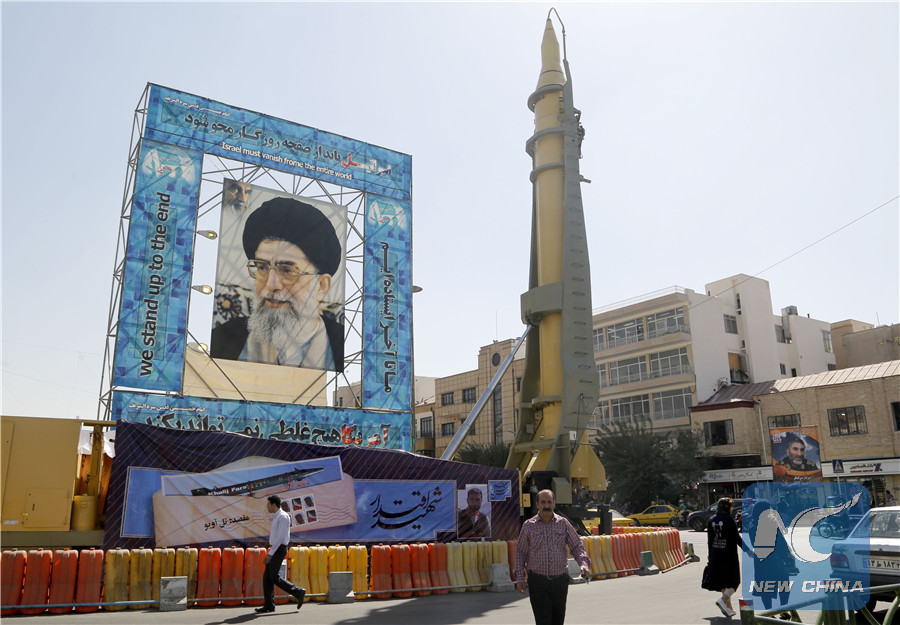 A Ghadr-F missile is displayed next to a portrait of Iran's Supreme Leader Ayatollah Ali Khamenei at a war exhibition to commemorate the 1980-88 Iran-Iraq war at Baharestan square, south of Tehran on September 26, 2016. (AFP/Xinhua)