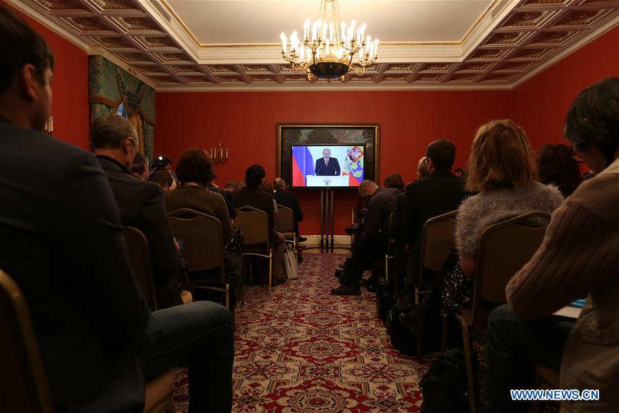 Journalists in the press-room listen to the presidential address by Russian President Vladimir Putin to the Federal Assembly in Moscow, Russia, on Dec. 1, 2016. Russia has been turning its attention to eastern Asia not because of its cooling ties with the West, but because of national interests, Russian President Vladimir Putin said in his annual state of the union address to the Federal Assembly on Thursday. (Xinhua/Evgeny Sinitsyn)