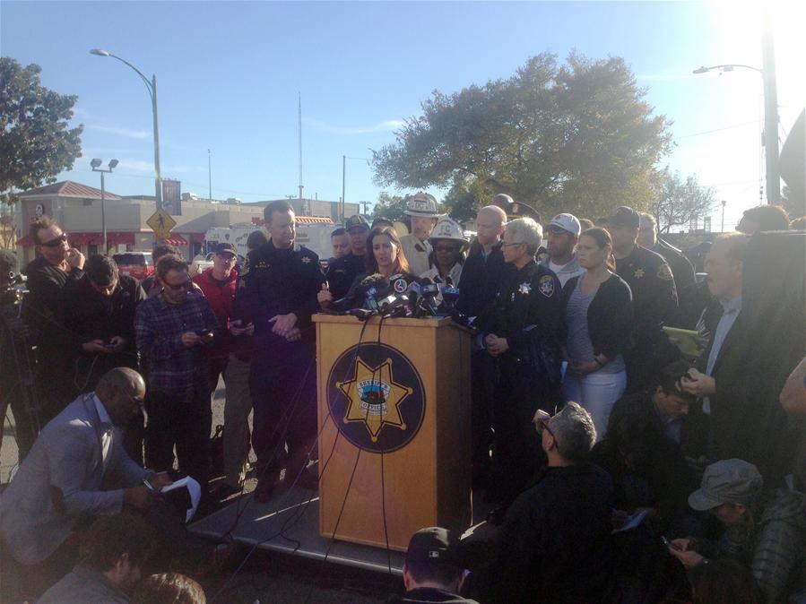 Oakland Mayor Libby Schaaf (C) addresses a news conference near the site of a fire in Oakland, east of San Francisco, the United States, on Dec. 3, 2016. An overnight fire killed at least 9 people while another 25 people were unaccounted for in Oakland, as of Saturday morning. (Xinhua/Xu Yong)