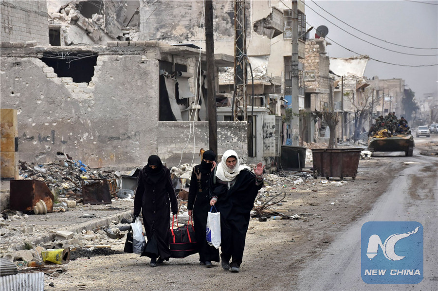 Syrian residents fleeing the eastern part of Aleppo walk through a street in Masaken Hanano, a former rebel-held district which was retaken by the regime forces last week, on November 30, 2016. (AFP/Xinhua)