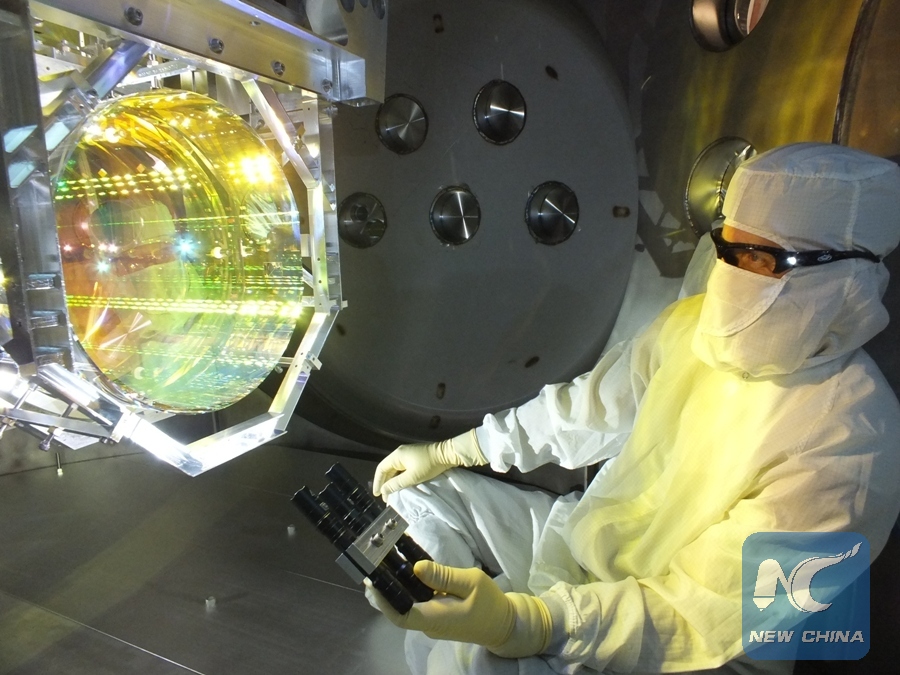 File photo shows a technician inspects one of LIGO's core optics (mirrors) by illuminating its surface with light at a glancing angles, prior to sealing up the chamber and pumping the vacuum system down. U.S. scientists said on February 11, 2016 that they have detected the existence of gravitational waves, which were predicted by Albert Einstein's theory of general relativity 100 years ago. (Xinhua/Matt Heintze/Caltech/MIT/LIGO Lab)