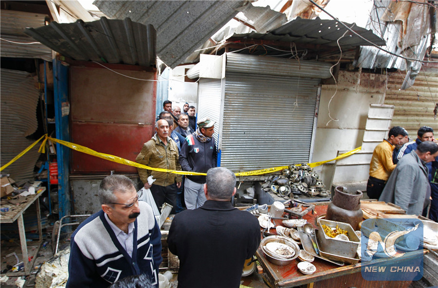 Iraqis look at the aftermath following a double bomb attack in a busy market area in Baghdad's central al-Sinek neighbourhood on December 31, 2016. (AFP/Xinhua)