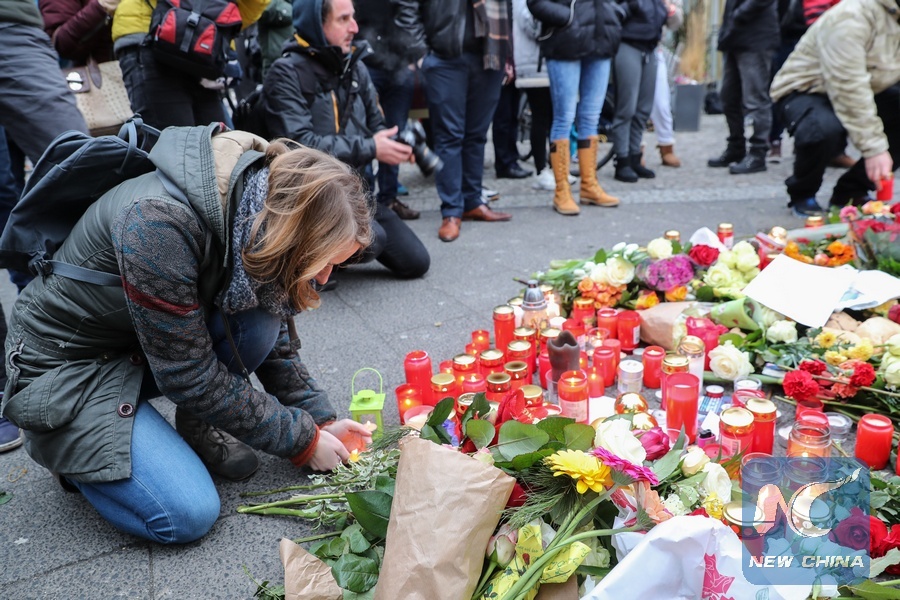 A woman lights a candle to mourn the victims of the attack at a Christmas market in Berlin, capital of Germany, on Dec. 20. 2016. (Xinhua/Shan Yuqi)