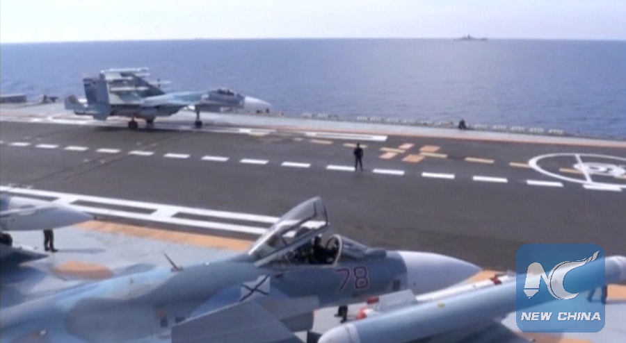 A still image taken from a video footage and released by Russia's Defence Ministry on November 15, 2016, shows jets on a deck of Russian Admiral Kuznetsov aircraft carrier near the coast of Syria. (Reuters File Photo)