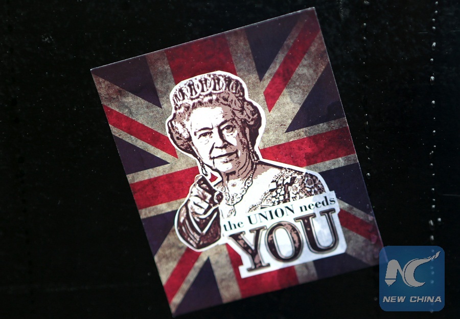 Photo taken on Sept. 19, 2014 shows a sticker with the word "the UNION needs YOU" after the Scottish Independence Referendum in Edinburgh, Scotland. The "No" campaign won the Scottish referendum on Friday to keep the territory within the United Kingdom.(Xinhua/Han Yan)