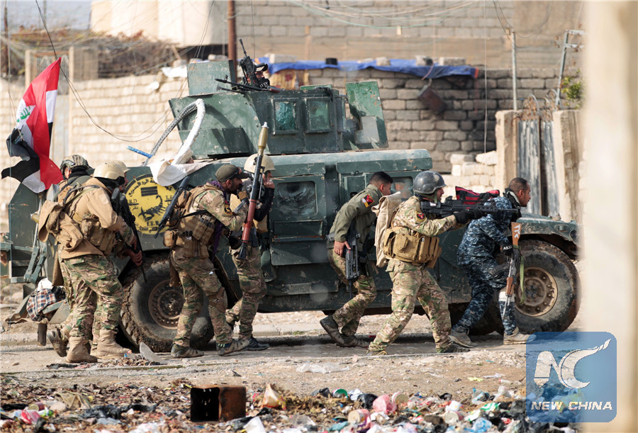 MOSUL, Iraq, Jan. 3 (Xinhua) -- Iraqi security forces on Tuesday fought fierce clashes with Islamic State (IS) group in the city of Mosul and retook control of the industrial area and a neighborhood in the sixth day of a renewed push to seize the eastern part of the city, the Iraqi military said.