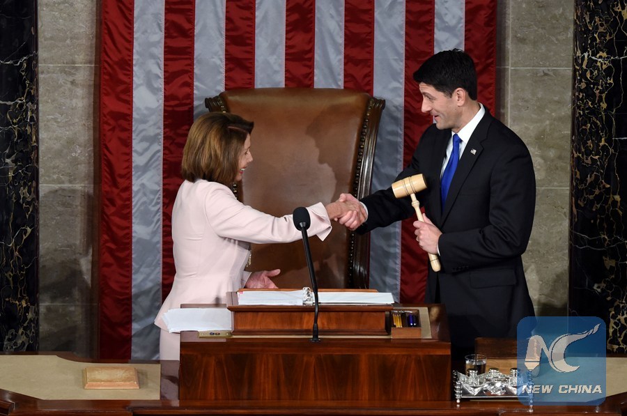 Paul Ryan receives the gavel from House Minority Leader Nancy Pelosi after being re-elected as House Speaker during the opening of the 115th US Congress on Capitol Hill in Washington, D.C., January 3, 2017.(Xinhua/Yin Bogu)