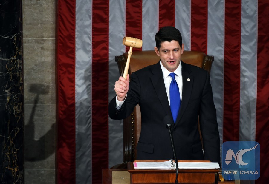 Paul Ryan raises the gavel after being re-elected as House Speaker during the opening of the 115th US Congress on Capitol Hill in Washington, D.C., January 3, 2017.(Xinhua/Yin Bogu)