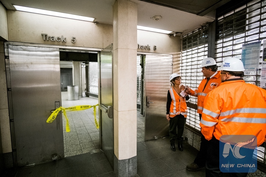 Long Island Railroad workers talk outside the platform where a train derailed at the Atlantic Terminal in Brooklyn, New York, the United States, Jan. 4, 2017. A Long Island Railroad (LIRR) train derailed during the morning rush hour on Wednesday in the Brooklyn Borough of New York City, injuring 103 people, according to local authorities.(Xinhua/Li Changxiang)
