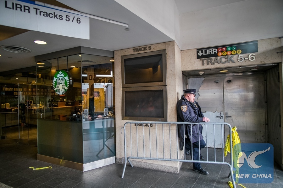 A police officer stands guard outside the platform where a train derailed at the Atlantic Terminal in Brooklyn, New York, the United States, Jan. 4, 2017. A Long Island Railroad (LIRR) train derailed during the morning rush hour on Wednesday in the Brooklyn Borough of New York City, injuring 103 people, according to local authorities. (Xinhua/Li Changxiang)