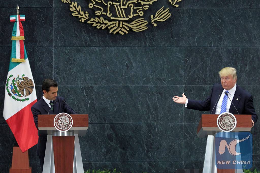 U.S. Republican presidential candidate Donald Trump (R) addresses a joint press conference with Mexican President Enrique Pena Nieto (L) after their meeting in Mexico City, capital of Mexico, on Aug. 31, 2016. (Xinhua/Str)