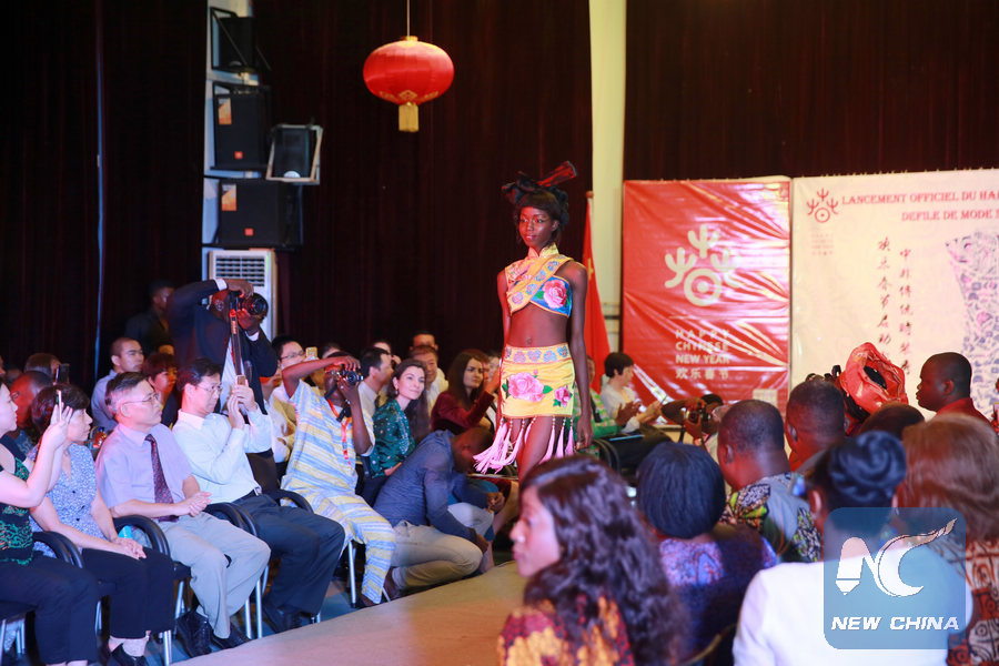 Photo shows a model wearing clothes with strong Chinese flavor during a fashion show that kickstarted Benin's 2-week long celebrations of Chinese Lunar New Year of 2017, the year of the Rooster. (Xinhua)