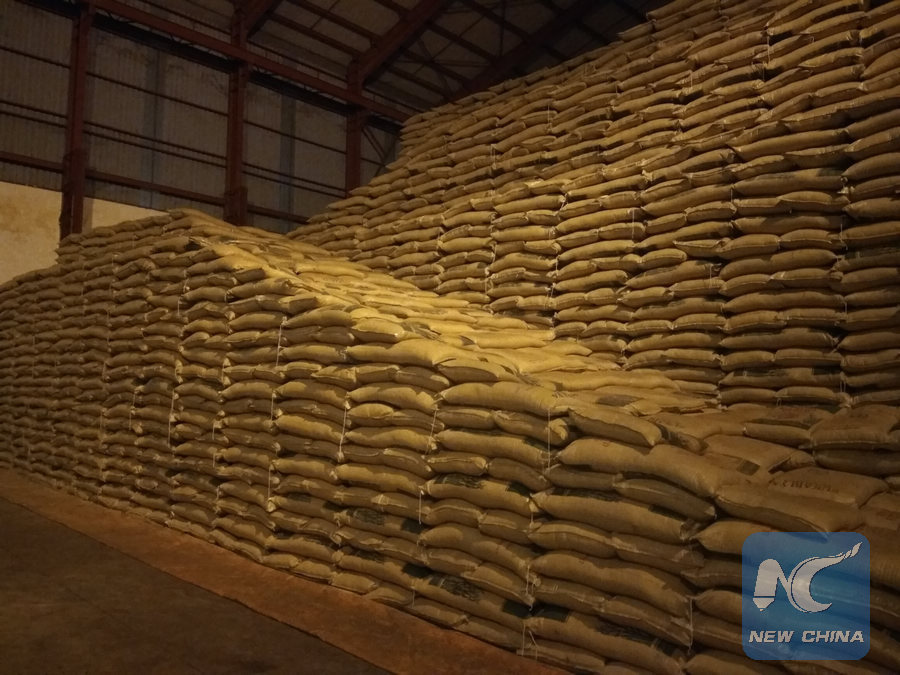 Sacks of sugar stored at Kakira Sugar factory in the eastern Ugandan district of Jinja, Jan. 4, 2016. Uganda is currently facing a sharp increase in sugar prices as a result of a long dry spell that has pushed down production levels and yet the demand is high. (Xinhua/Ronald Ssekandi)