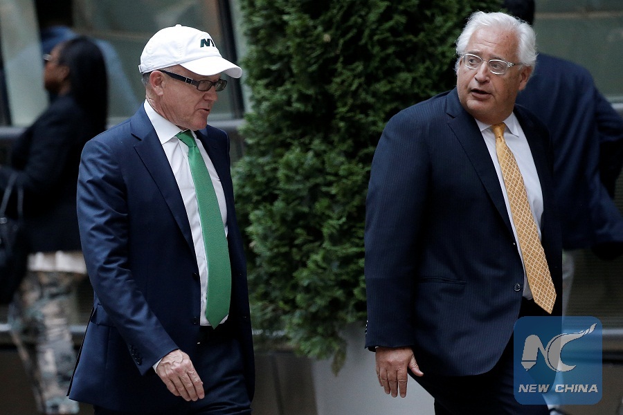 Attorney David Friedman (R) walks with U.S. businessman Robert Wood "Woody" Johnson as they arrive at a private fundraiser for then-Republican presidential candidate Donald Trump in the Manhattan borough of New York City, June 21, 2016. Friedman is U.S. President-elect Donald Trump's designated Ambassador to Israel. Picture taken June 21, 2016. (Xinhua/Reuters Photo)