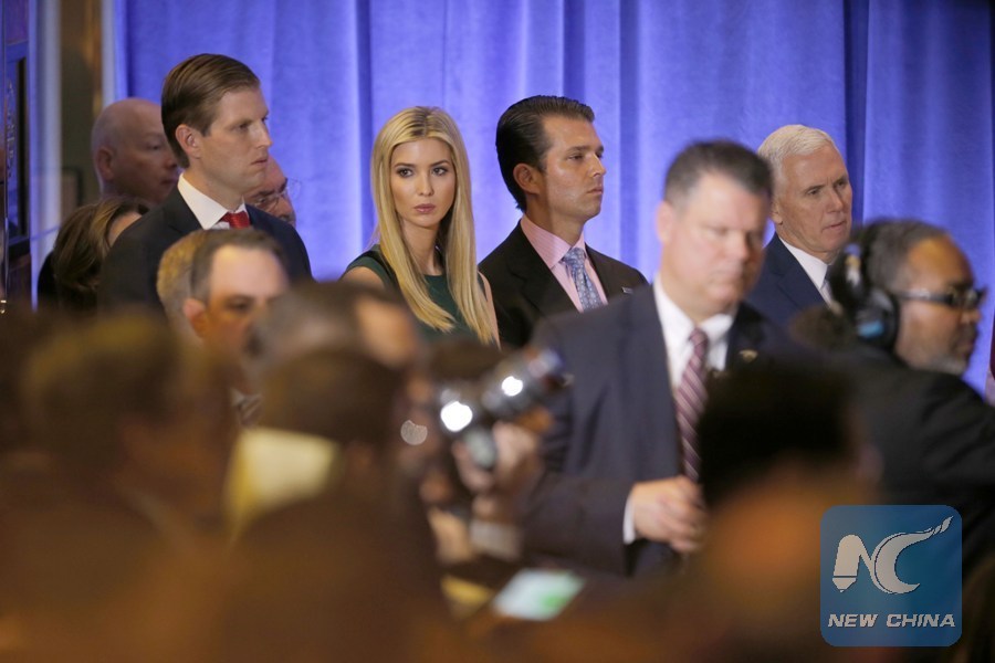 Eric Trump, Ivanka Trump and Donald Trump Jr. with U.S. Vice President-elect Mike Pence (from L to R, rear) attend a news conference held by U.S. President-elect Donald Trump in New York, the United States, on Jan. 11, 2017. U.S. President-elect Donald Trump met the press Wednesday for the first news conference since the election. (Xinhua/Gary Hershorn)