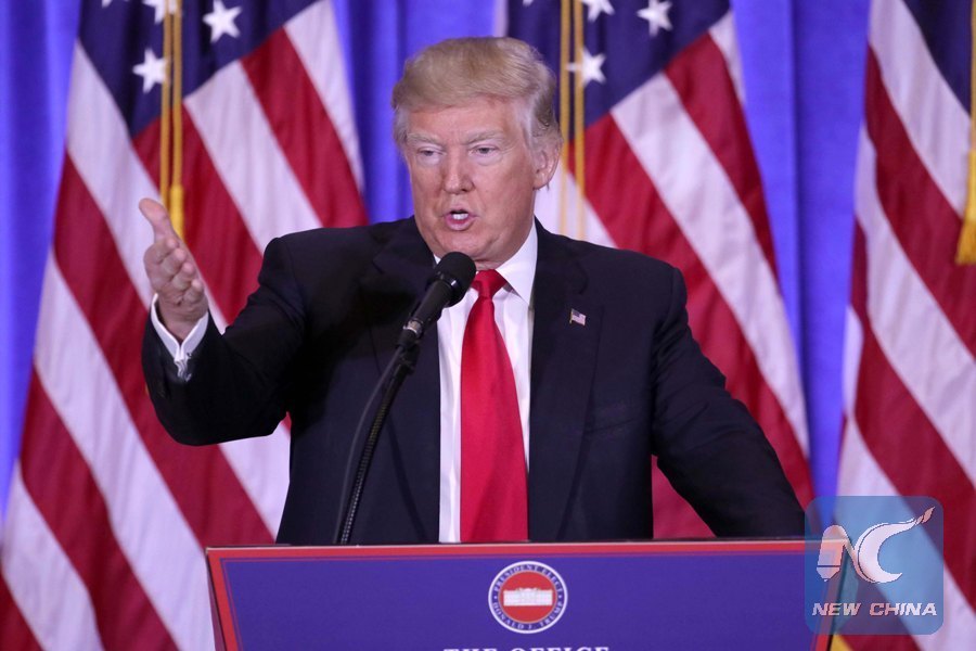 U.S. President-elect Donald Trump speaks during a news conference in New York, the United States, on Jan. 11, 2017. U.S. President-elect Donald Trump met the press Wednesday for the first news conference since the election. (Xinhua/Gary Hershorn)