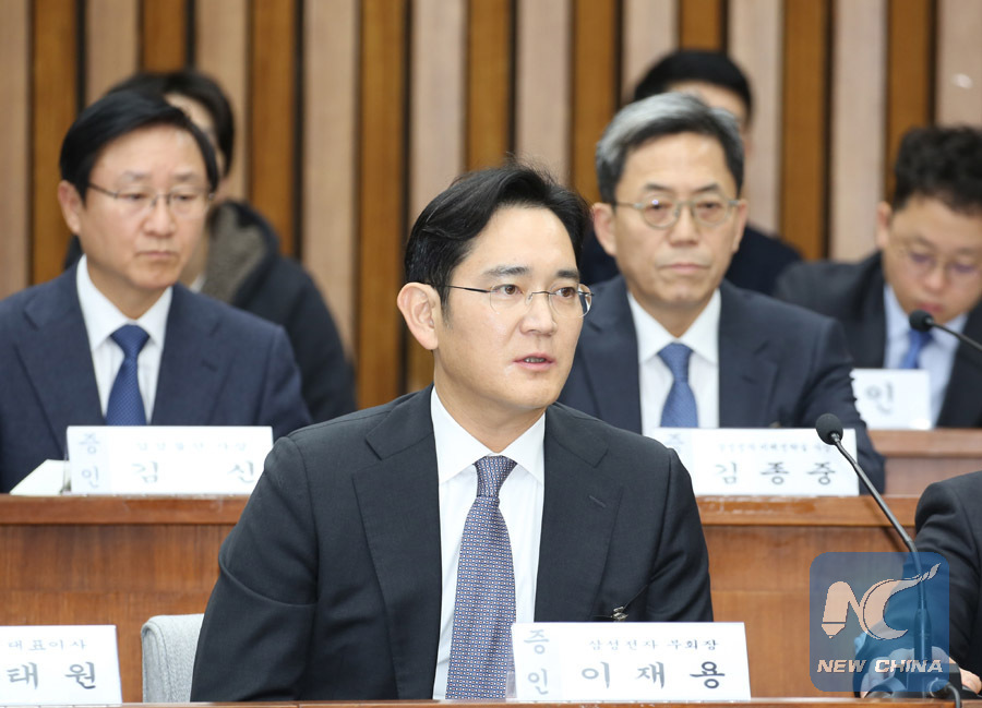 File photo taken on Dec. 6, 2016 shows Samsung Electronics Vice Chairman Lee Jae-yong attends the first parliamentary hearing for a scandal involving President Park Geun-hye in Seoul, South Korea. (Xinhua/Lee Sang-ho)
