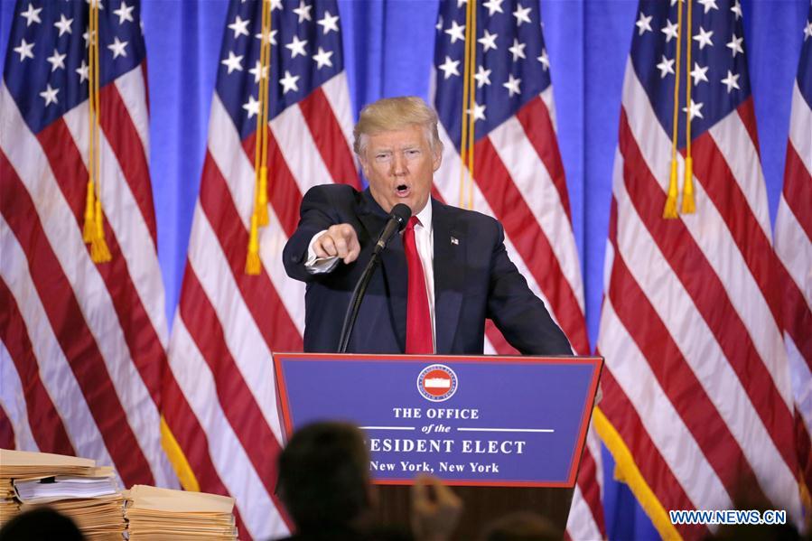 U.S. President-elect Donald Trump gestures during a news conference in New York, the United States, on Jan. 11, 2017. U.S. President-elect Donald Trump met the press Wednesday for the first news conference since the election. (Xinhua/Gary Hershorn)
