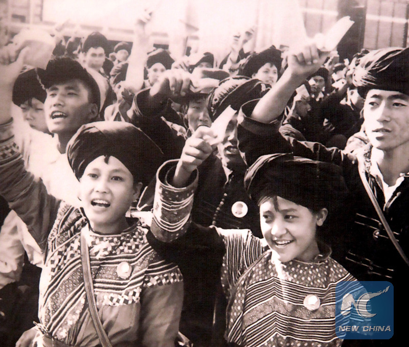 People of ethnic Yi group celebrate the opening of the railway in the 1970s. (Provided to Xinhua)