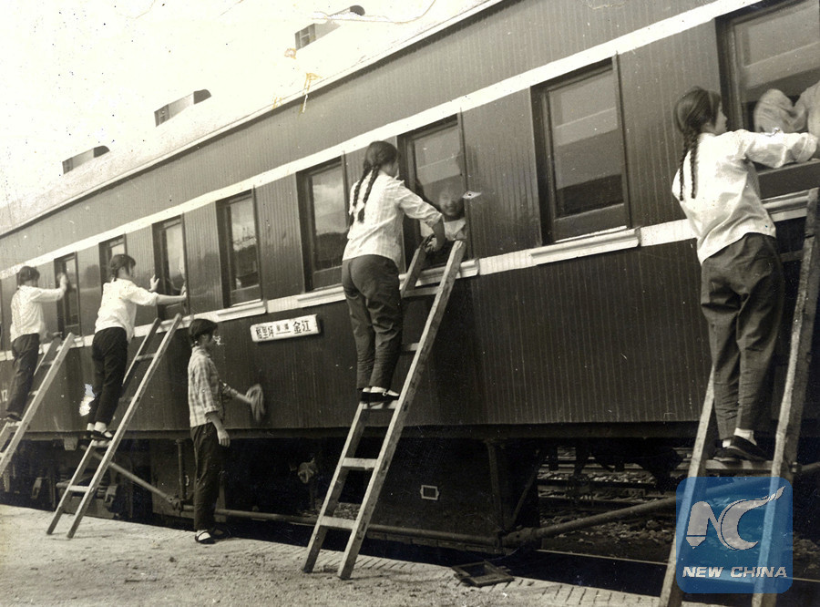 Workers clean up the train carriages in the 1970s. (Provided to Xinhua)