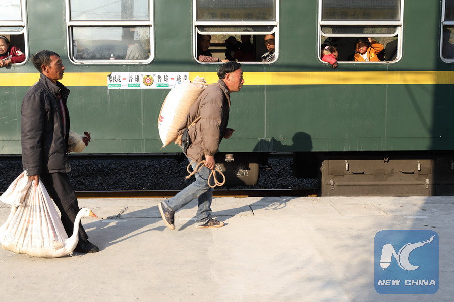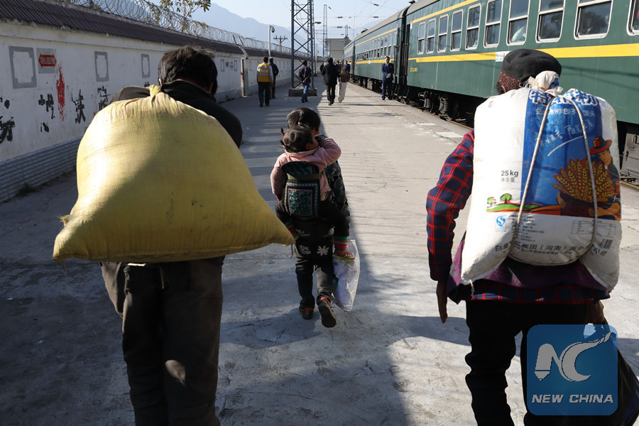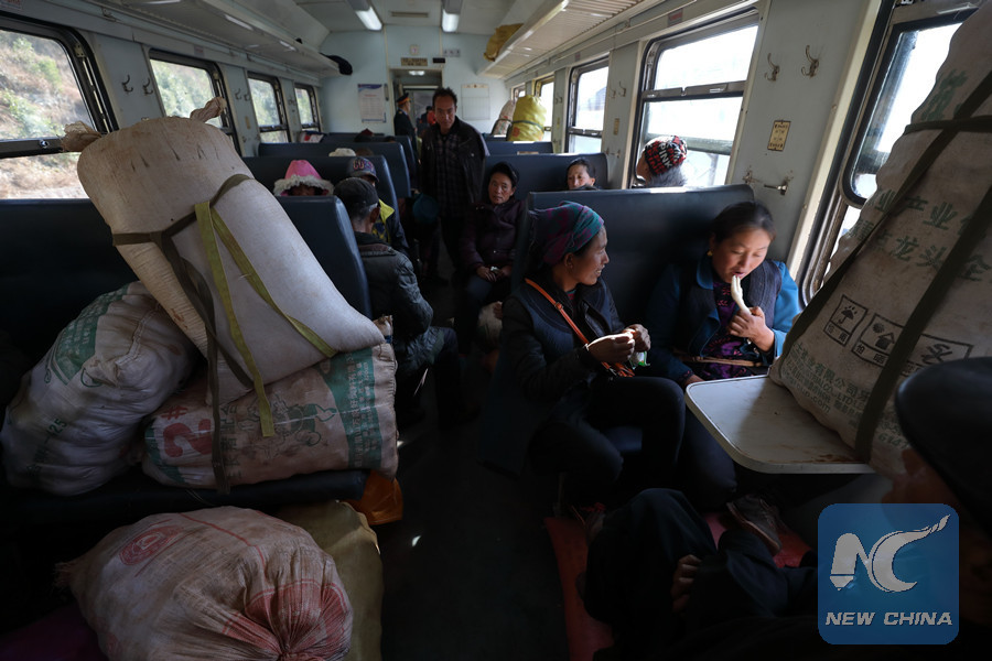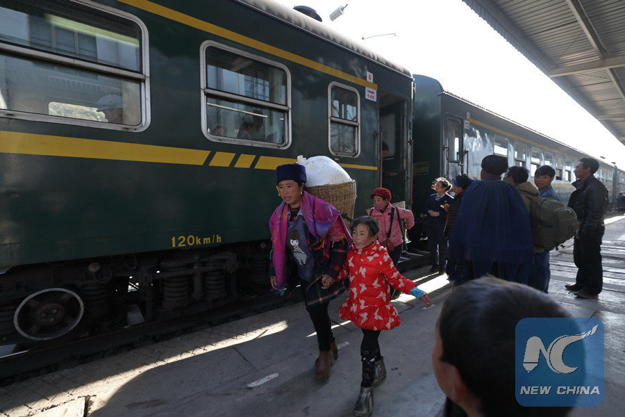 Passengers of ethnic Yi group unload luggage from the train on Jan. 16, 2016. (Xinhua/Jiang Jinghong)