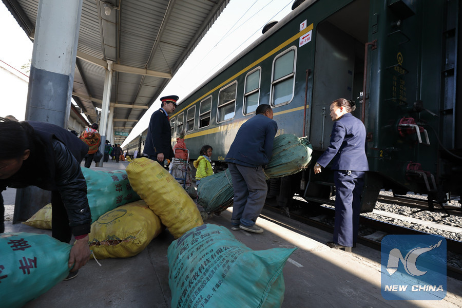 Jike Waze carries luggage to the train on Jan. 16, 2016. (Xinhua/Jiang Jinghong)