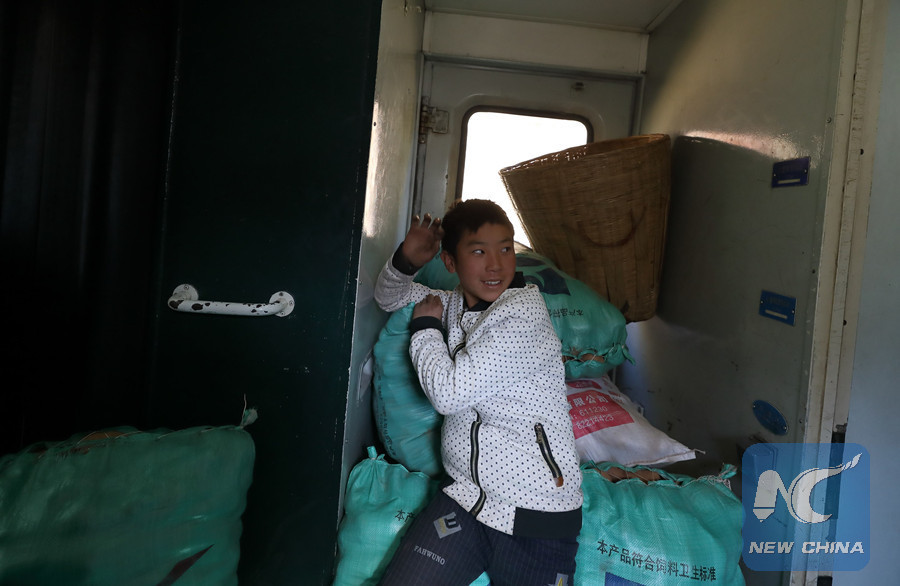 A boy of ethnic Yi group sit on piles of luggage in the train on Jan. 16, 2016. (Xinhua/Jiang Jinghong)
