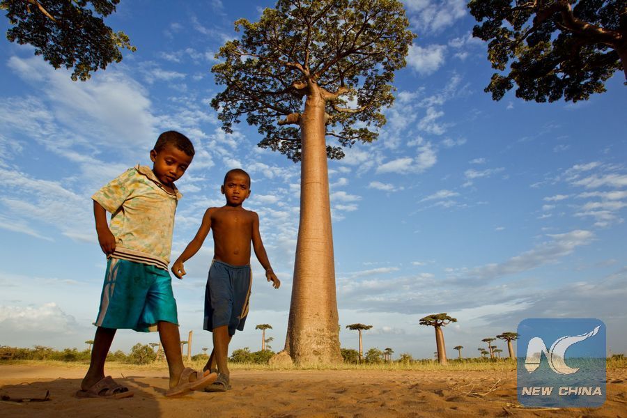File photo shows local villagers walk down the Avenue of Baobabs, 15km north of Morondava in west Madagascar, Dec. 22, 2013. Along the Avenue De Baobabs, one of the most visited site in Madagascar, remains some 20 to 25 baobab trees about 30 meters in height. (Xinhua/Li Jing)