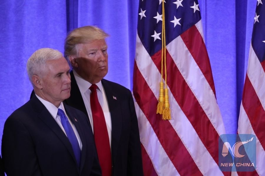 U.S. President-elect Donald Trump (R) stands next to U.S. Vice President-elect Mike Pence during a news conference in New York, the United States, on Jan. 11, 2017. (Xinhua/Gary Hershorn)
