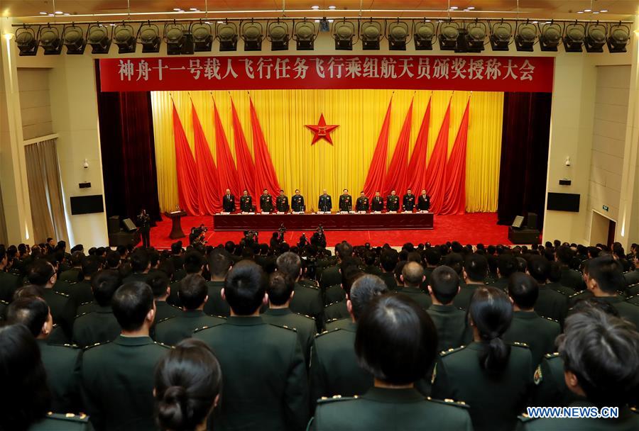 BEIJING, Jan. 20 (Xinhua) -- China on Friday held a ceremony to honor the two astronauts of the Shenzhou-11 spaceflight mission for their outstanding contributions to the country's space endeavors.