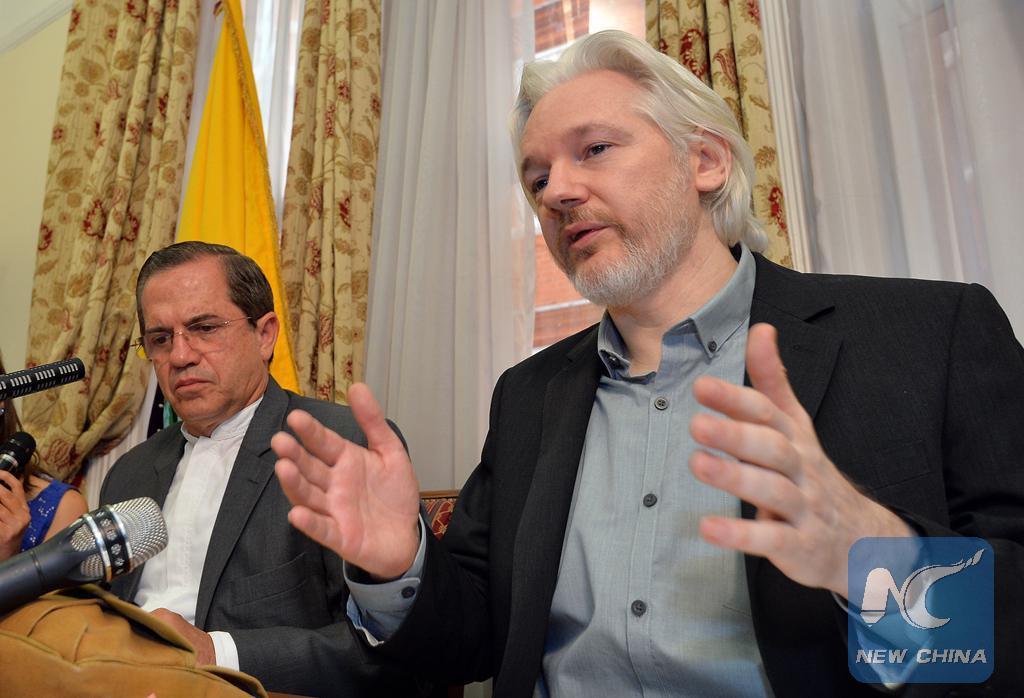 WikiLeaks founder Julian Assange (R) and Ecuadorian Foreign Minister Ricardo Patino attend a press conference at the Ecuadorian Embassy in London, Britain, Aug. 18, 2014. (Xinhua/Press Association/John Stillwell)