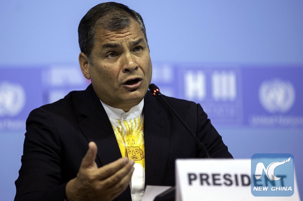 Ecuadoran President Rafael Correa delivers a speech during the opening ceremony of the 3rd United Nations Conference on Housing and Sustainable Urban Development, or Habitat III, in Quito, capital of Ecuador, Oct. 17, 2016. (Xinhua/Santiago Armas)